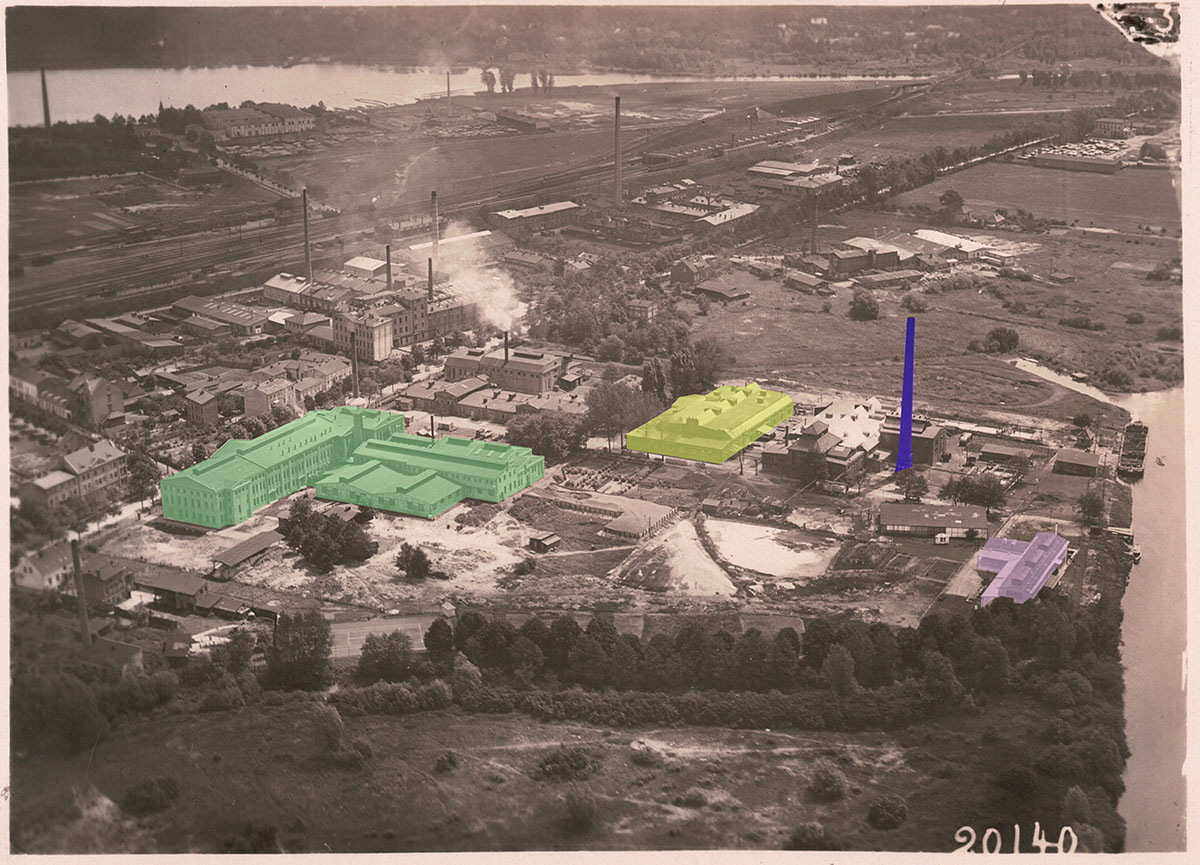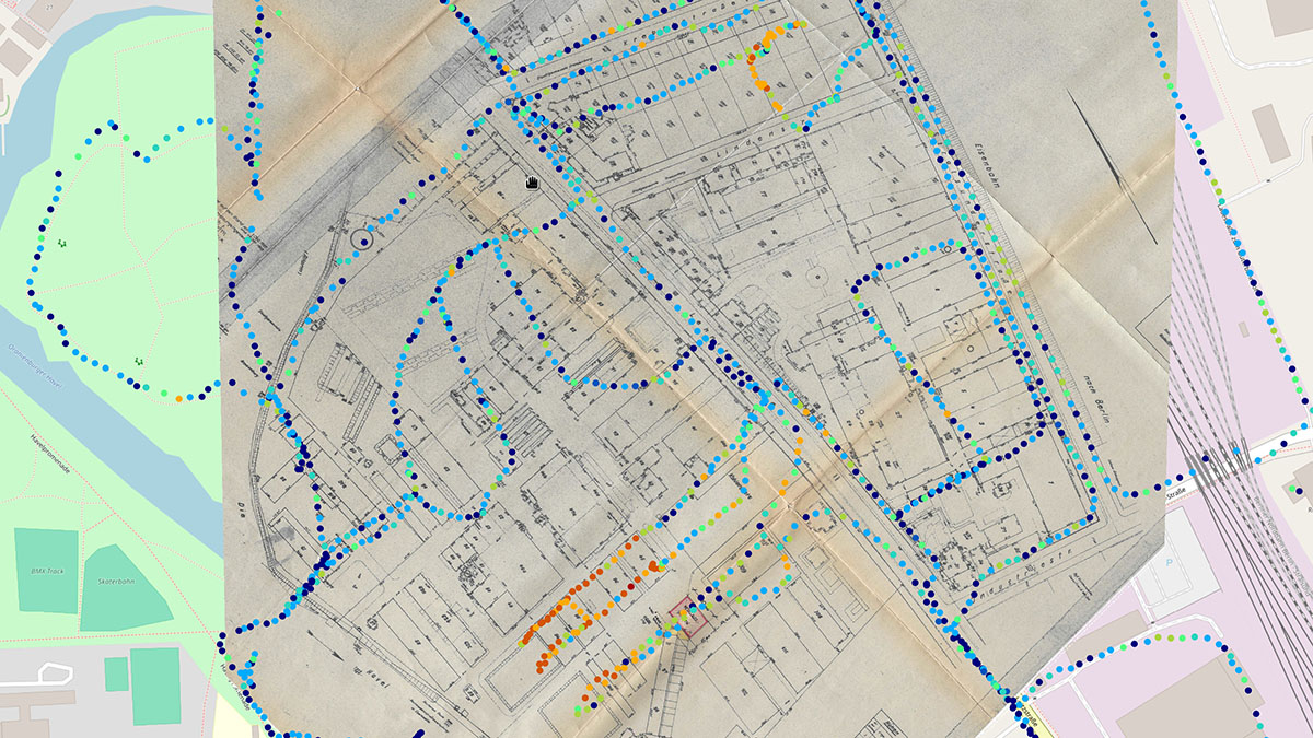 In fact, the Auer factory was located at the Lindenring contamination site. Unfortunately, there are no visible material residues from the factory buildings. This makes it all the more important that an aerial photograph of the Auer plant from 1928 has been preserved. The factory premises are clearly within the contamination spot, as shown by a superimposition of the 2018 measurements with OpenStreetMap. However, this representation also shows that it is impossible to prove any connection between specific work processes in the factory and corresponding material residues on the basis of these sources.