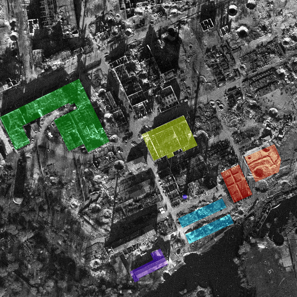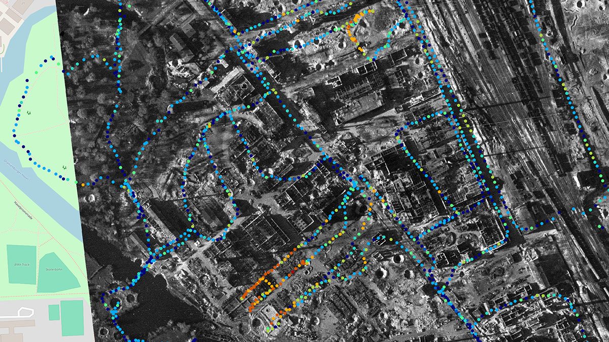 Then why did not a single brick survive the factory’s subsequent history? Air photos taken by the American Allies assess and document the effects of Oranienburg’s carpet bombing of 15 March. A comparison of the »Damage Assessment Reports« with a site plan of the factory from 1940 confirms the extent of the destruction. This visualisation via different historical layers in QGIS enables the identification of specific buiding groups. This brings us back to the question of why and for what purposes thorium was processed at the Auer plant.