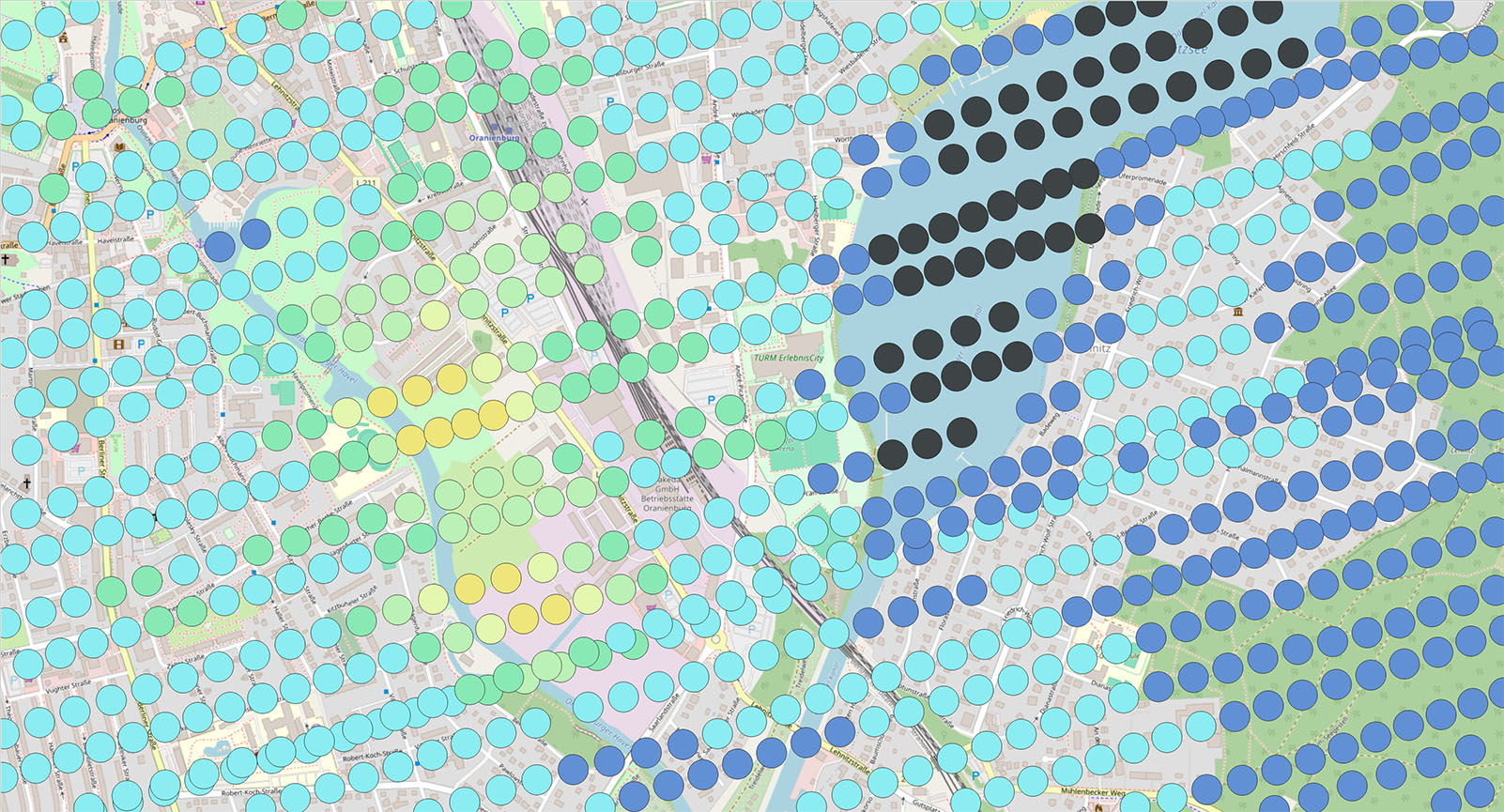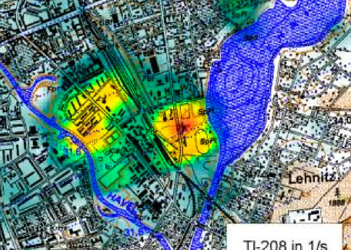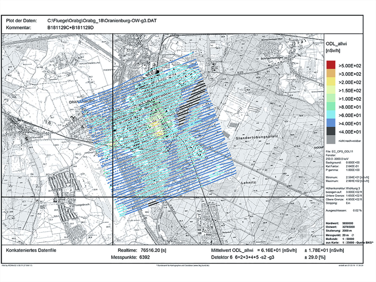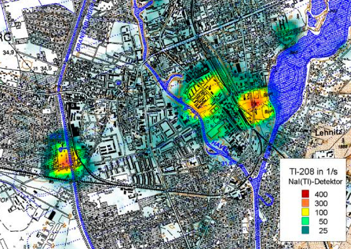 In July 1997, an area of 45 km² around the city of Oranienburg was systematically scanned by helicopter flight on behalf of the »Bundesamt für Strahlenschutz«. The aircraft was equipped with a gamma spectrometer that recorded radiation anomalies on parallel flight paths at an altitude of 200 m. Already after the fall of the inner German border, in 1991, the responsible Landesbundesamt had carried out measurements of the local gamma dose rate on the ground. Both measurement campaigns confirmed what was already known during the GDR era: individual areas in Oranienburg had gamma values up to a thousand times higher than the regional average.