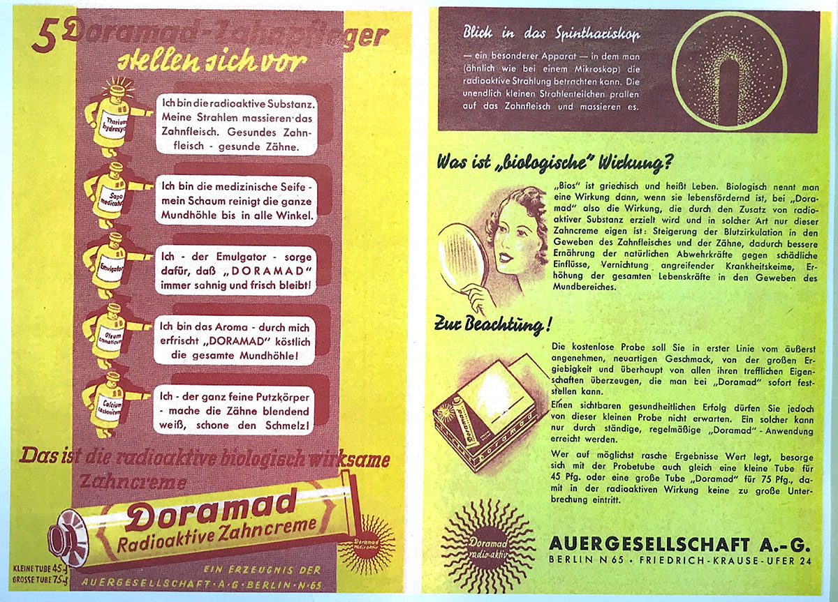 All three moments are decisive for my longue durée argument and for our thesis that nuclear power should be understood as part of the age of rare earths. It is commodification that leads from incandescent mantles to the dubiouse uranium machine: in order to maintain the economic power of the company, the Auer company had to diversify its products. This firstly led to the production of radioactive luminous paints or toothpaste, then to the mass production of gas masks, and finally to the conversion of the manufacturing complex for uranium enrichment. To sum it up: rare earths only became radioactive around the time of the First World War, when it was necessary to open up new markets and new products.