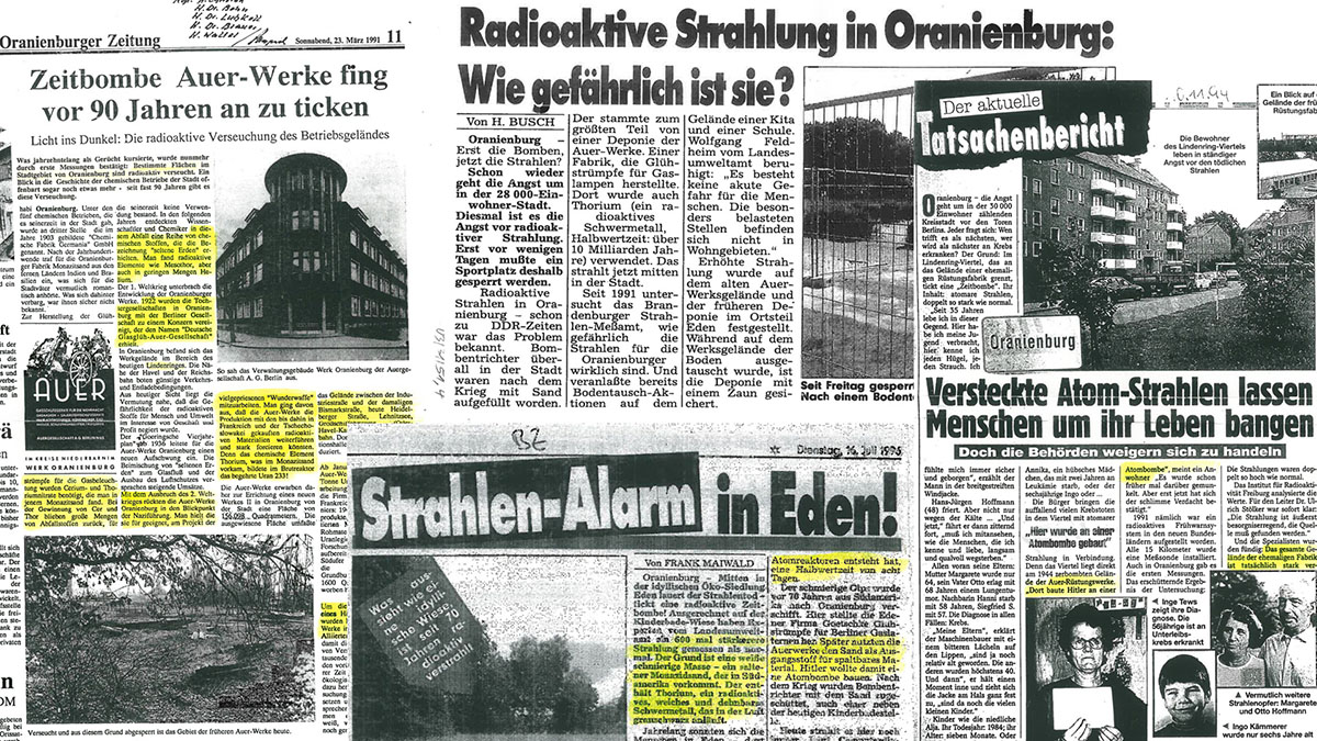 In any case, we should avoid the fallacy of characterising the period between 1945 and 1985 as naive or even ignorant in terms of environmental awareness. Knowledge of pollutants is strongly determined by historical and cultural factors. The extent of this is evident in the first documents for public awareness of radioactive remnants of Oranienburg’s history. Newspapers of the 1990s are intensively struggling for attention, relevance and assessment of the Auer heritage.