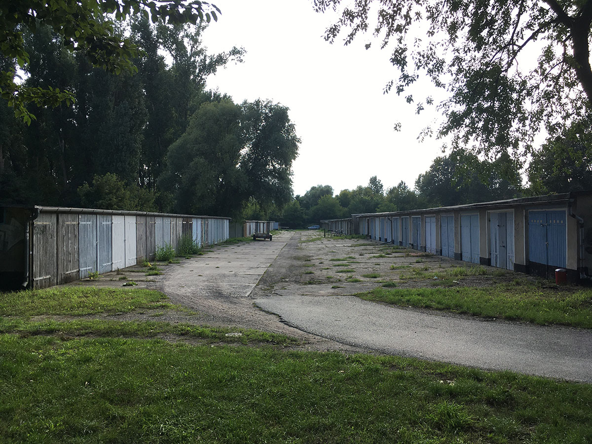 To answer this question, we took our own measurements of gamma activity in Oranienburg. The measurements were linked to GPS coordinates and connected to historical data via geomapping. The »walk« across the site of the former Auer factory reveals two spots of contamination. Let’s take a look at the measurement area in the south as an example. Today, the site is covered with garages, probably dating from the 1950s/60s, and has already been intensively researched in the past. Evidence of these measurements can be seen in the form of drill holes at regular intervals on the concrete slabs.